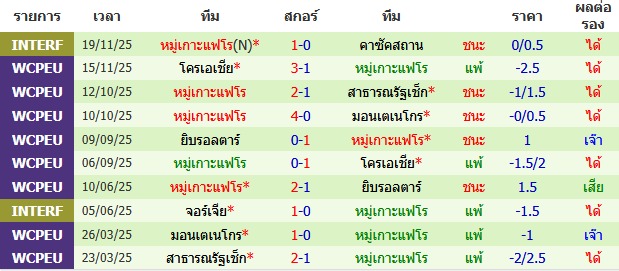 ผลงาน 10 นัดหลังสุดของทีม หมู่เกาะแฟโร