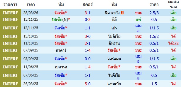 ผลงาน 10 นัดหลังสุดของทีม รัสเซีย
