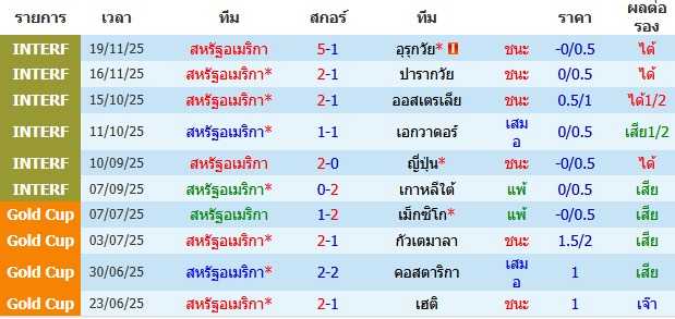 ผลงาน 10 นัดหลังสุดของทีม สหรัฐอเมริกา