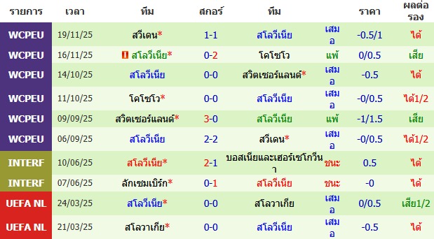 ผลงาน 10 นัดหลังสุดของทีม สโลวีเนีย