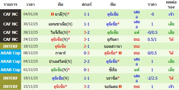 ผลงาน 10 นัดหลังสุดของทีม ตูนิเซีย
