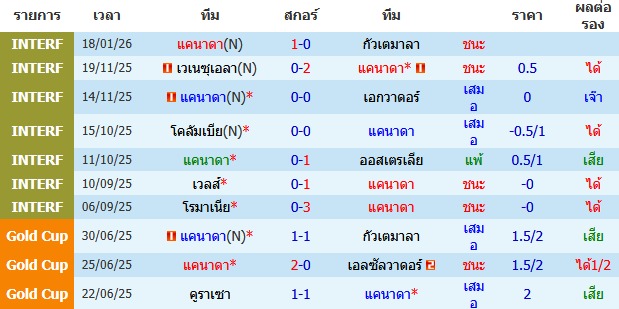 ผลงาน 10 นัดหลังสุดของทีม แคนาดา