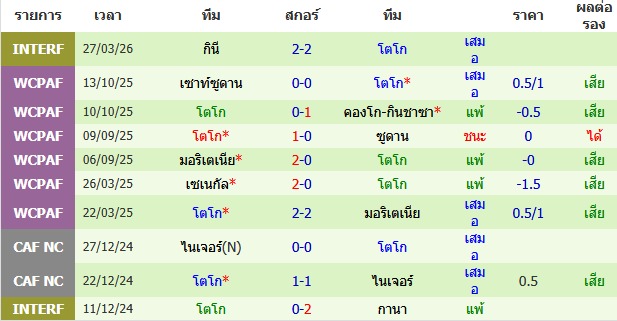 ผลงาน 10 นัดหลังสุดของทีม โตโก