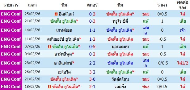 ผลงาน 10 นัดหลังสุดของทีม ซัตตั้น ยูไนเต็ด
