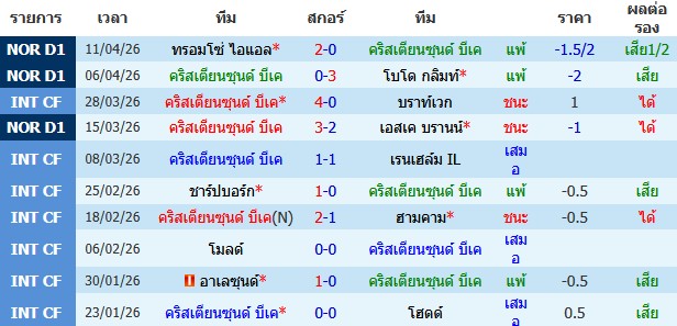 ผลงาน 10 นัดหลังสุดของทีม คริสเตียนซุนด์