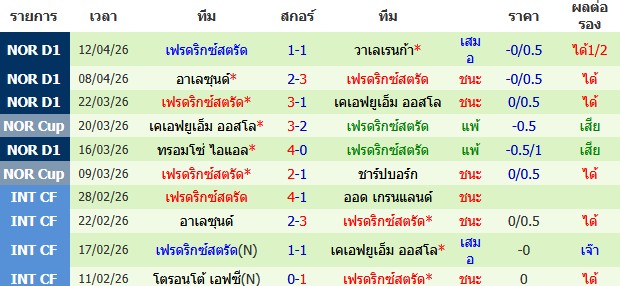 ผลงาน 10 นัดหลังสุดของทีม เฟรดริกซ์สตรัด