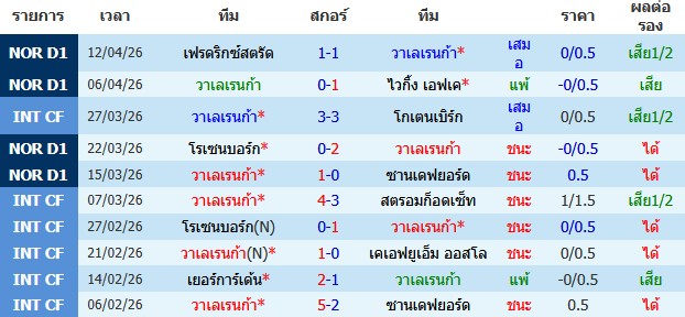ผลงาน 10 นัดหลังสุดของทีม วาเลเรนก้า