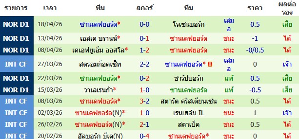 ผลงาน 10 นัดหลังสุดของทีม ซานเดฟยอร์ด