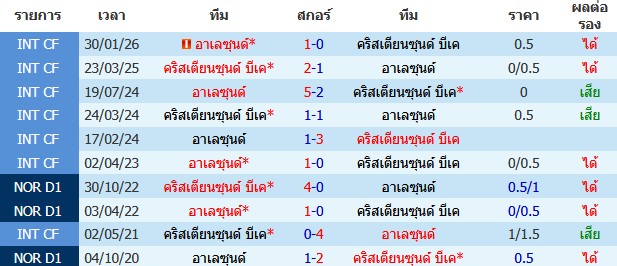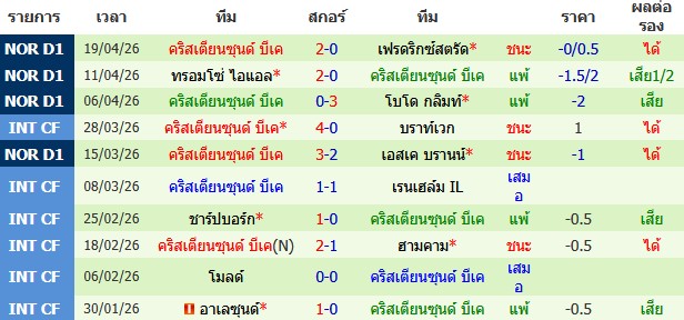ผลงาน 10 นัดหลังสุดของทีม คริสเตียนซุนด์ บีเค