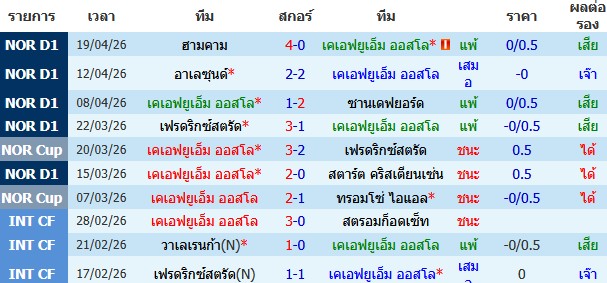 ผลงาน 10 นัดหลังสุดของทีม เคเอฟยูเอ็ม ออสโล