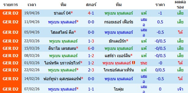 ผลงาน 10 นัดหลังสุดของทีม พรูเบน มุนสเตอร์