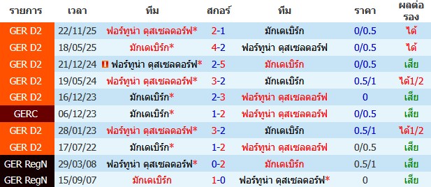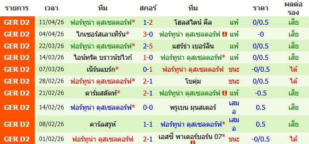 ผลงาน 10 นัดหลังสุดของทีม ฟอร์ทูน่า ดุสเซลดอร์ฟ