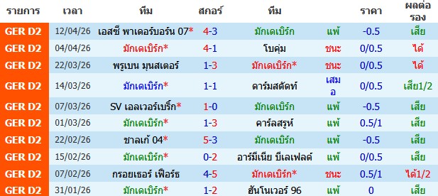 ผลงาน 10 นัดหลังสุดของทีม มักเดเบิร์ก