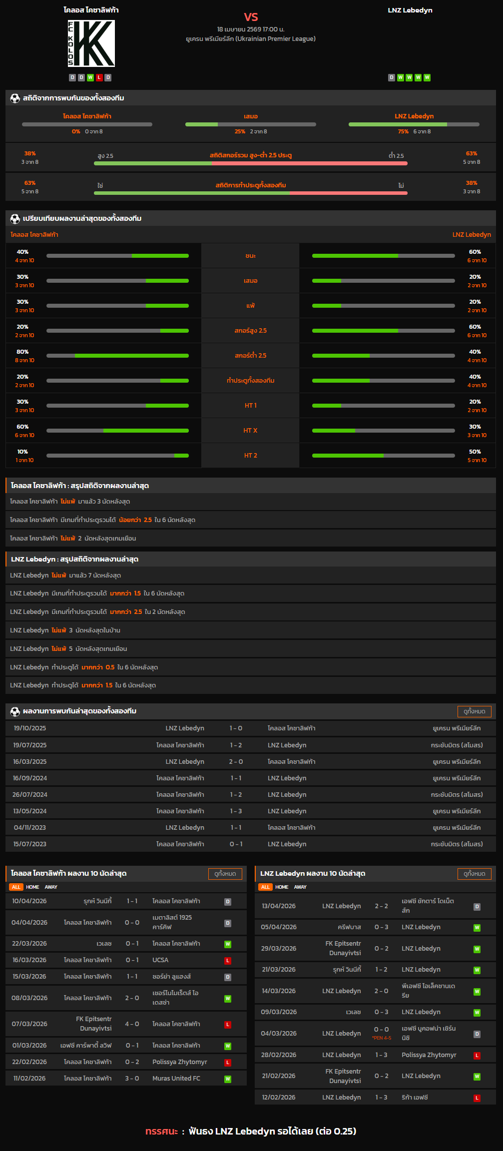 วิเคราะห์บอล ยูเครน พรีเมียร์ลีก 2025-26 โคลอส โคซาลิฟก้า VS LNZ Lebedyn