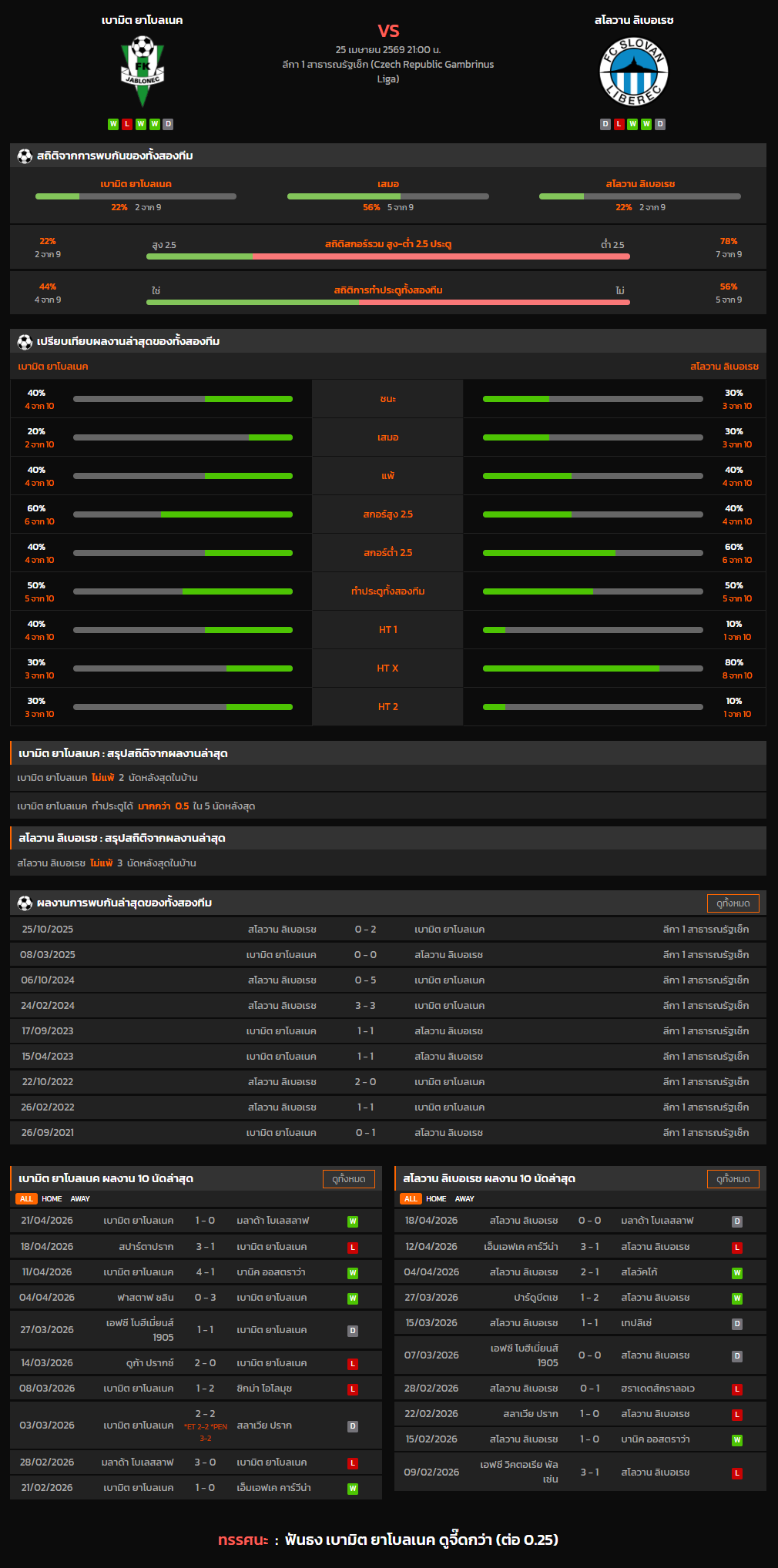 วิเคราะห์บอล ลีกา 1 สาธารณรัฐเช็ก 2025-26 เบามิต ยาโบลเนค VS สโลวาน ลิเบอเรช