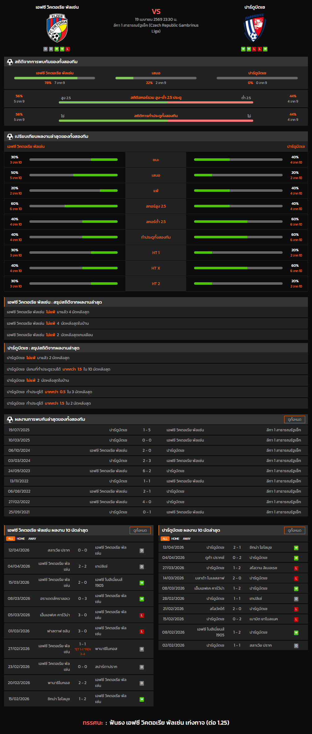 วิเคราะห์บอล ลีกา 1 สาธารณรัฐเช็ก 2025-26 เอฟซี วิคตอเรีย พัลเซ่น VS ปาร์ดูบีตเซ