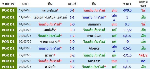ผลงาน 10 นัดหลังสุดของทีม วิตอเรีย กิมาไรส์
