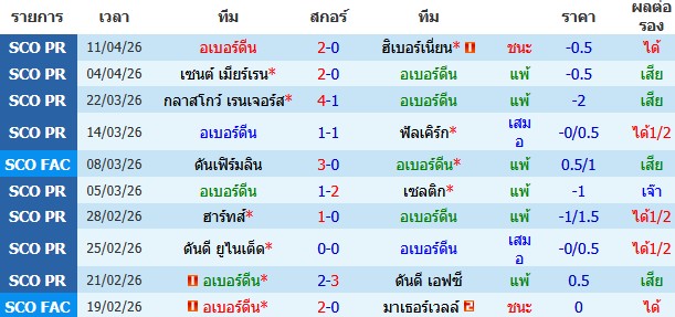ผลงาน 10 นัดหลังสุดของทีม อเบอร์ดีน