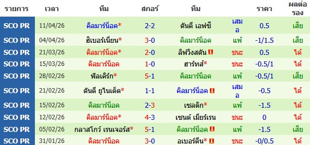 ผลงาน 10 นัดหลังสุดของทีม คิลมาร์น็อค