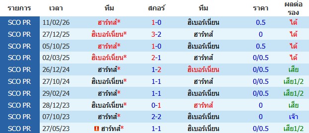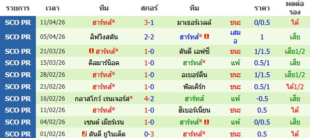 ผลงาน 10 นัดหลังสุดของทีม ฮาร์ทส์