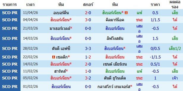 ผลงาน 10 นัดหลังสุดของทีม ฮิเบอร์เนี่ยน