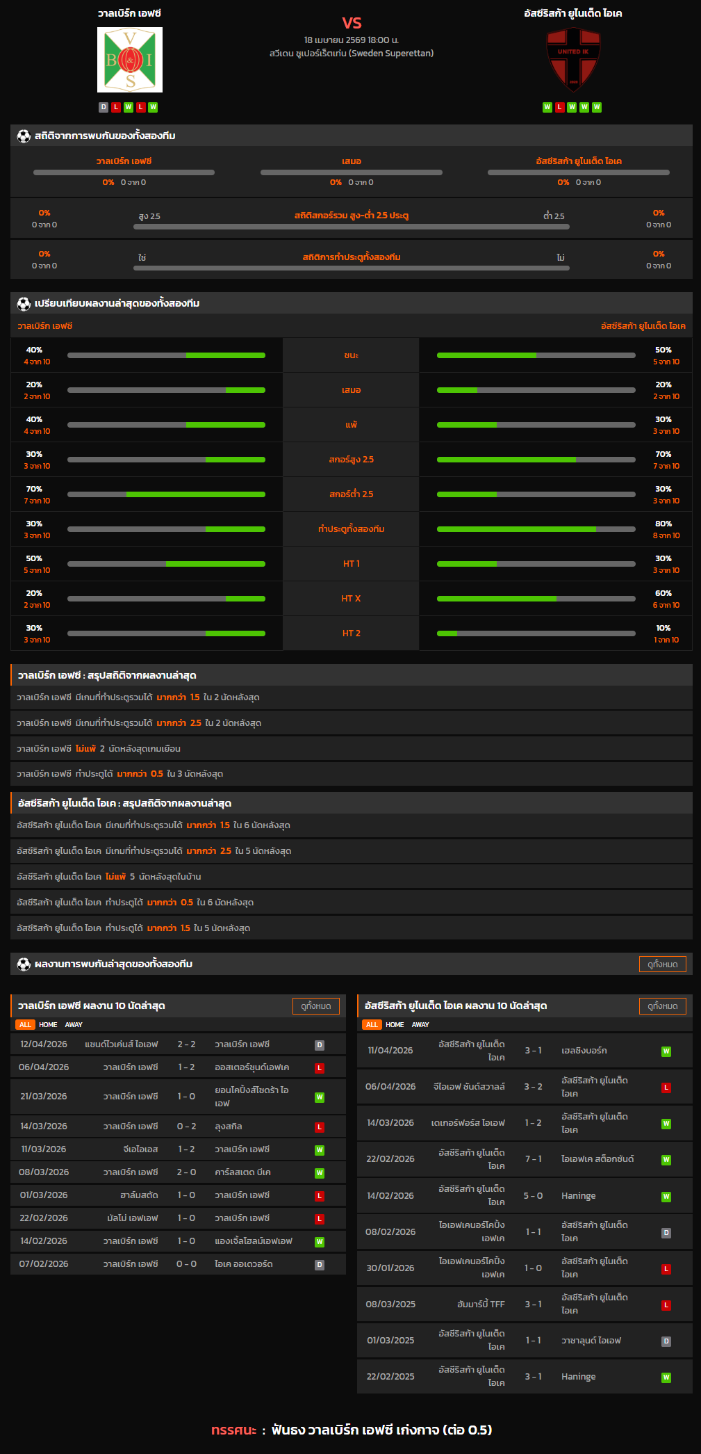 วิเคราะห์บอล สวีเดน ซูเปอร์เร็ตเท่น 2025-26 วาลเบิร์ก เอฟซี VS อัสซีริสก้า ยูไนเต็ด ไอเค