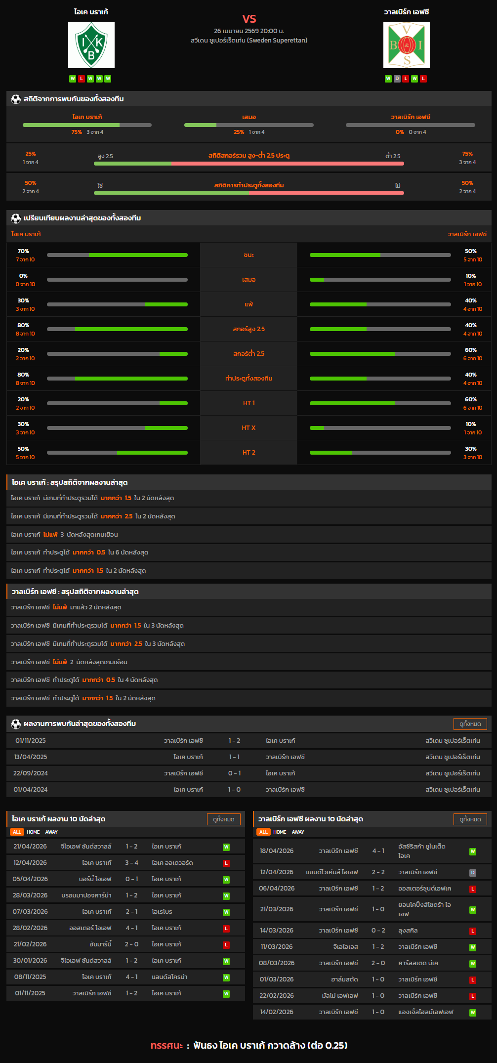 วิเคราะห์บอล สวีเดน ซูเปอร์เร็ตเท่น 2025-26 ไอเค บราเก้ VS วาลเบิร์ก เอฟซี