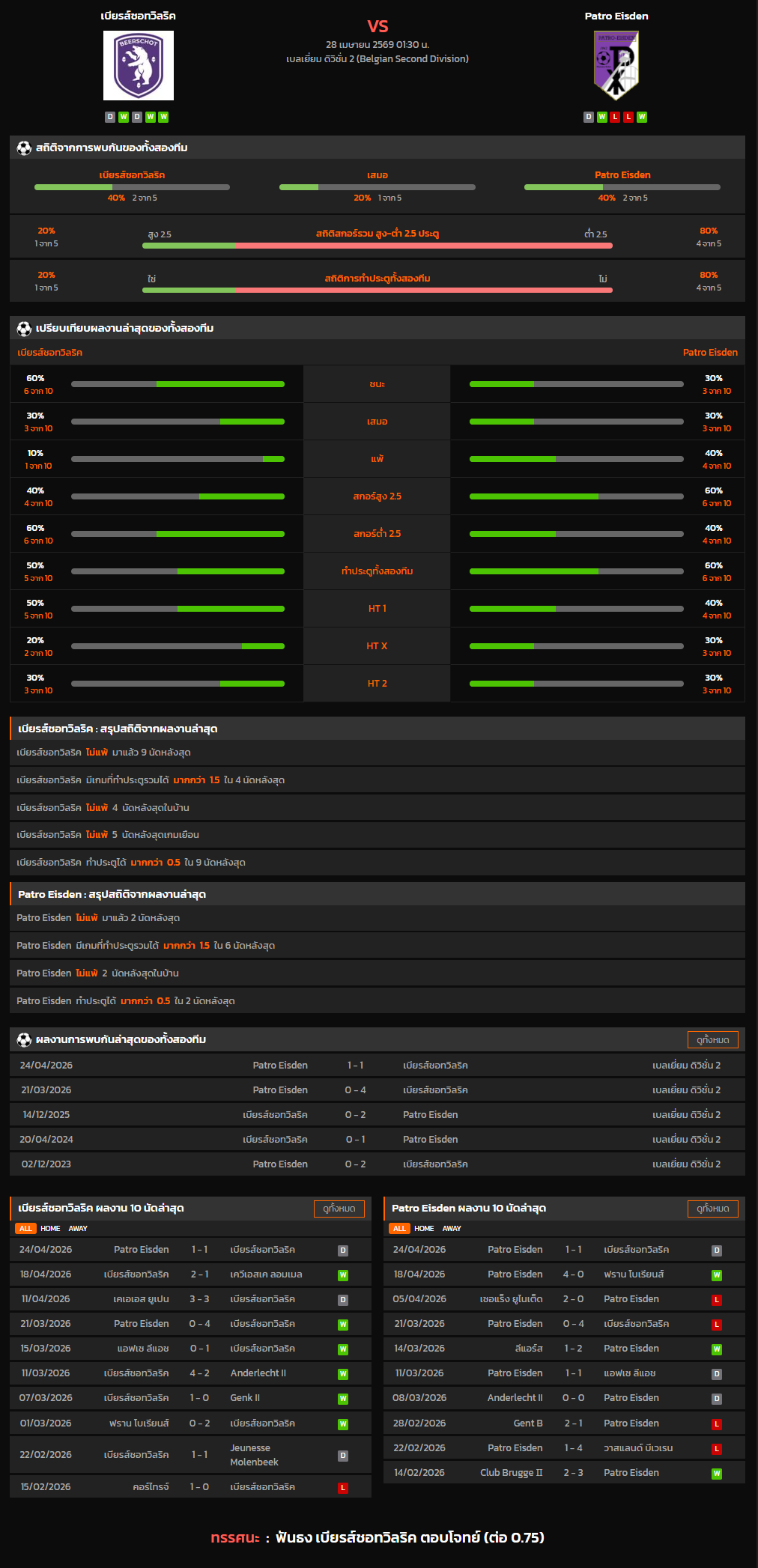 วิเคราะห์บอล เบลเยี่ยม ดิวิชั่น 2 2025-26 เบียรส์ชอทวิลริค VS Patro Eisden