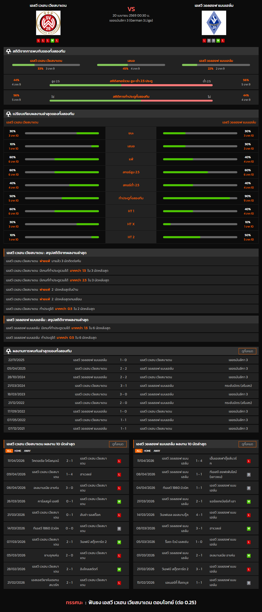 วิเคราะห์บอล เยอรมันลีกา 3 2025-26 เอสวี เวเฮน เวียสบาเดน VS เอสวี วอลฮอฟ แมนเฮล์ม