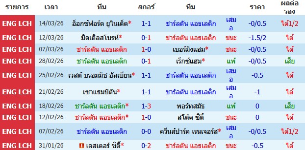 ผลงาน 10 นัดหลังสุดของทีม ชาร์ลตัน แอธเลติก
