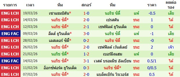 ผลงาน 10 นัดหลังสุดของทีม นอริช ซิตี้