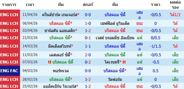 ผลงาน 10 นัดหลังสุดของทีม บริสตอล ซิตี้