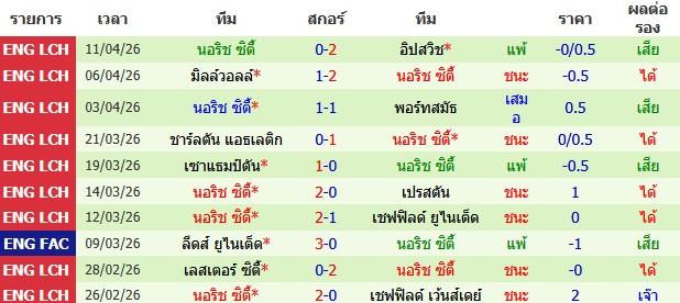 ผลงาน 10 นัดหลังสุดของทีม นอริช ซิตี้