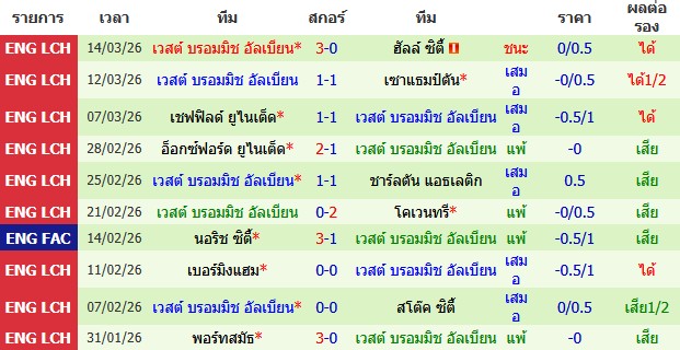 ผลงาน 10 นัดหลังสุดของทีม เวสต์บรอมวิช