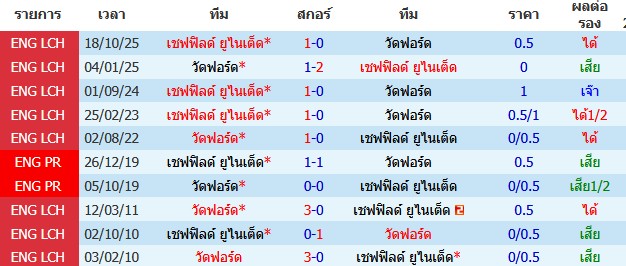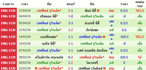ผลงาน 10 นัดหลังสุดของทีม เชฟฟิลด์ ยูไนเต็ด