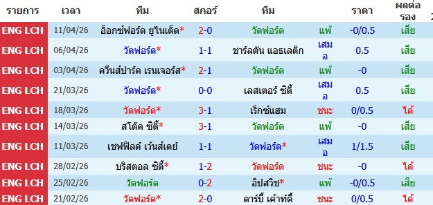 ผลงาน 10 นัดหลังสุดของทีม วัตฟอร์ด