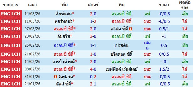 ผลงาน 10 นัดหลังสุดของทีม สวอนซี ซิตี้