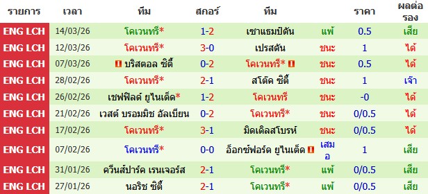 ผลงาน 10 นัดหลังสุดของทีม โคเวนทรี่