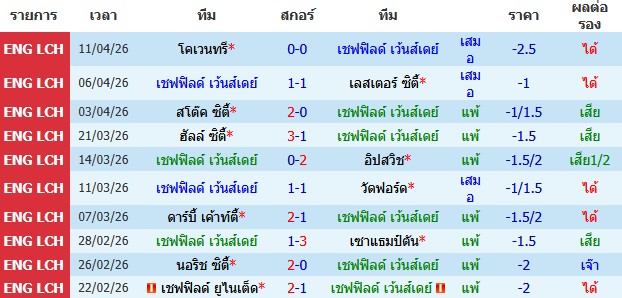 ผลงาน 10 นัดหลังสุดของทีม เชฟฟิลด์ เว้นส์เดย์