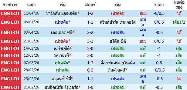 ผลงาน 10 นัดหลังสุดของทีม เปรสตัน