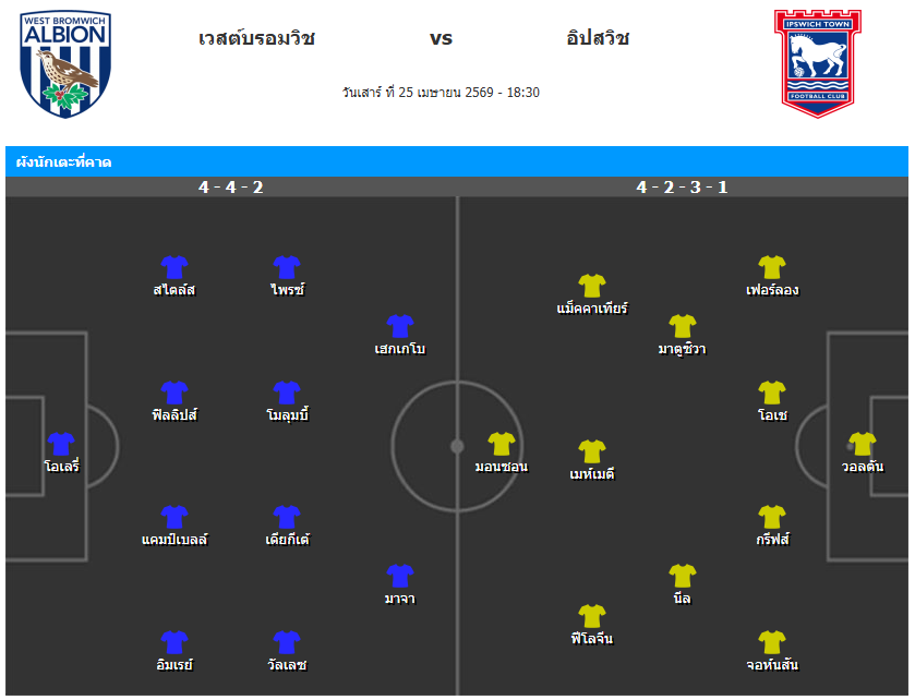 เวสต์บรอมวิช อยู่ในฟอร์มที่ดี ไม่แพ้มา 9 เกมติดต่อกันแล้ว (ชนะ 4 เสมอ 5) ตอนนี้ยืนยันความปลอดภัยเรียบร้อย ขณะที่ อิปสวิช ได้เปรียบตรงที่มีเกมตกค้างในมือ แต่การมาเยือนที่นี่ไม่ง่าย คาดว่ามีโอกาสสะดุดเสมอ