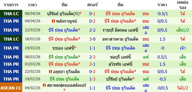ผลงาน 10 นัดหลังสุดของทีม บีจี ปทุม ยูไนเต็ด