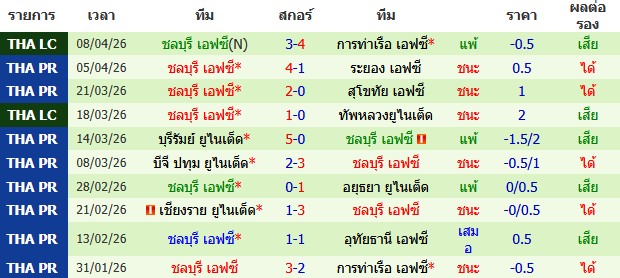 ผลงาน 10 นัดหลังสุดของทีม ชลบุรี เอฟซี