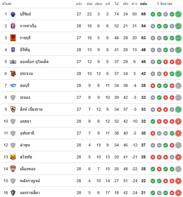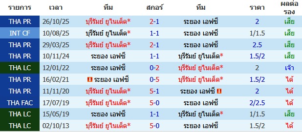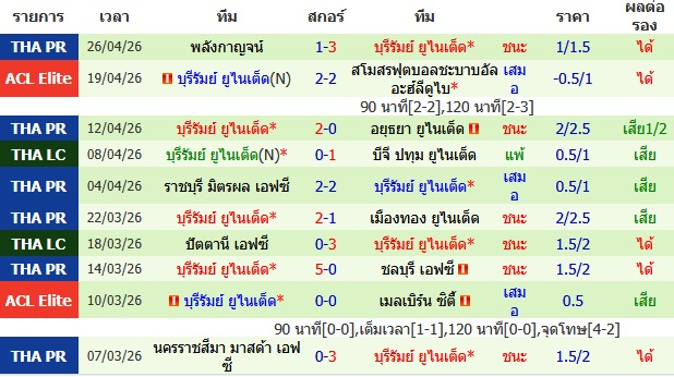 ผลงาน 10 นัดหลังสุดของทีม บุรีรัมย์ ยูไนเต็ด