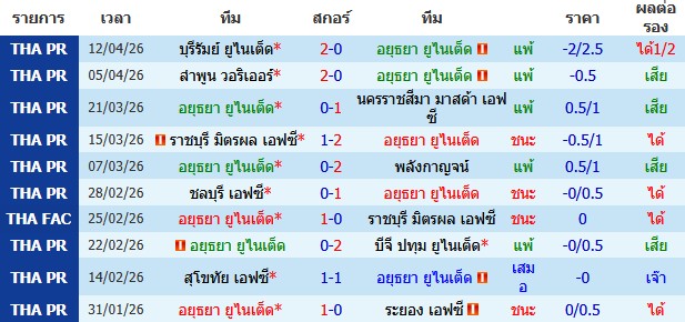 ผลงาน 10 นัดหลังสุดของทีม อยุธยา ยูไนเต็ด