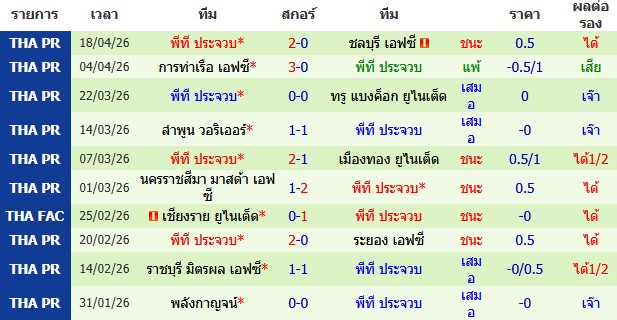 ผลงาน 10 นัดหลังสุดของทีม พีที ประจวบ