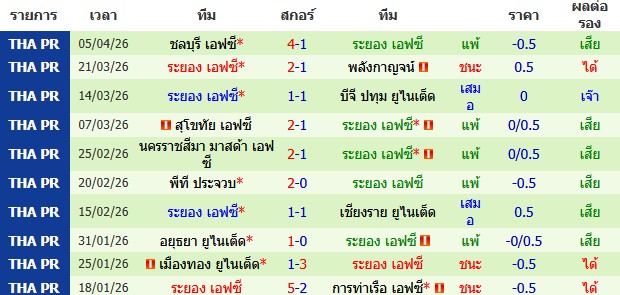 ผลงาน 10 นัดหลังสุดของทีม ระยอง เอฟซี
