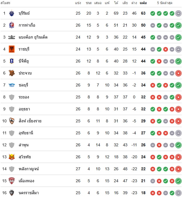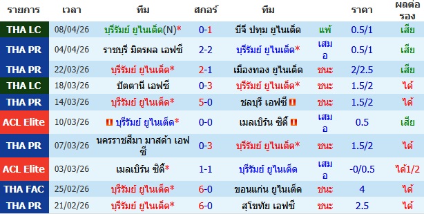 ผลงาน 10 นัดหลังสุดของทีม บุรีรัมย์ ยูไนเต็ด