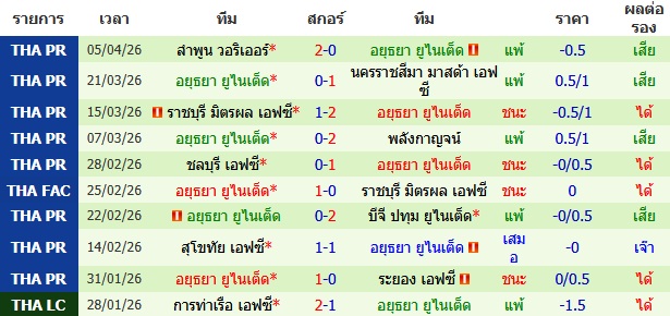 ผลงาน 10 นัดหลังสุดของทีม อยุธยา ยูไนเต็ด