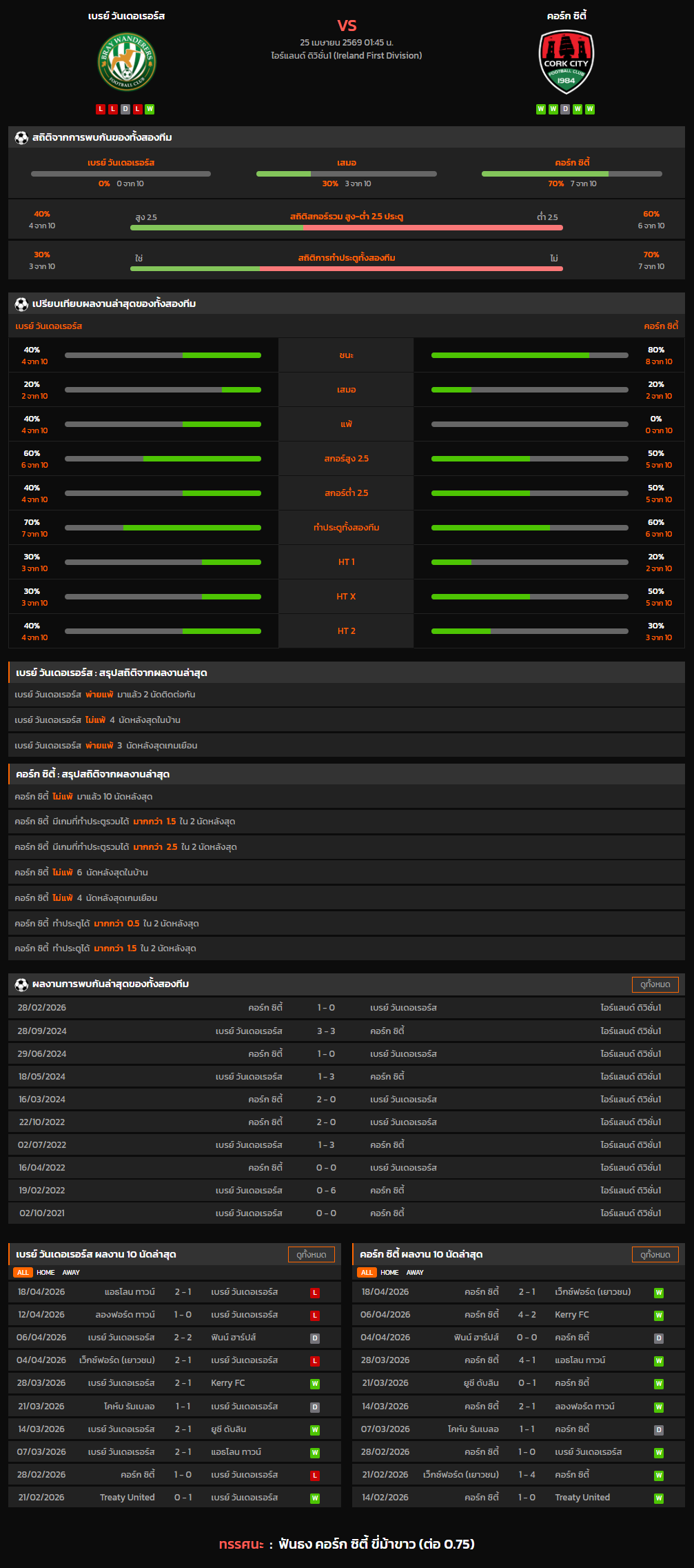 วิเคราะห์บอล ไอร์แลนด์ ดิวิชั่น 1 2025-26 เบรย์ วันเดอเรอร์ส VS คอร์ก ซิตี้